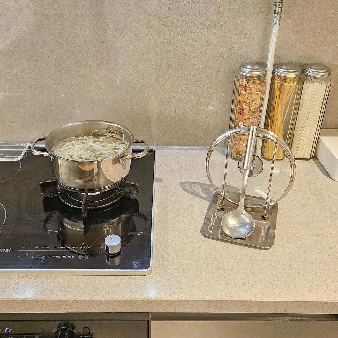 Giá đỡ nắp nồi chắc chắn, dùng lâu dài không lo gỉ sét.