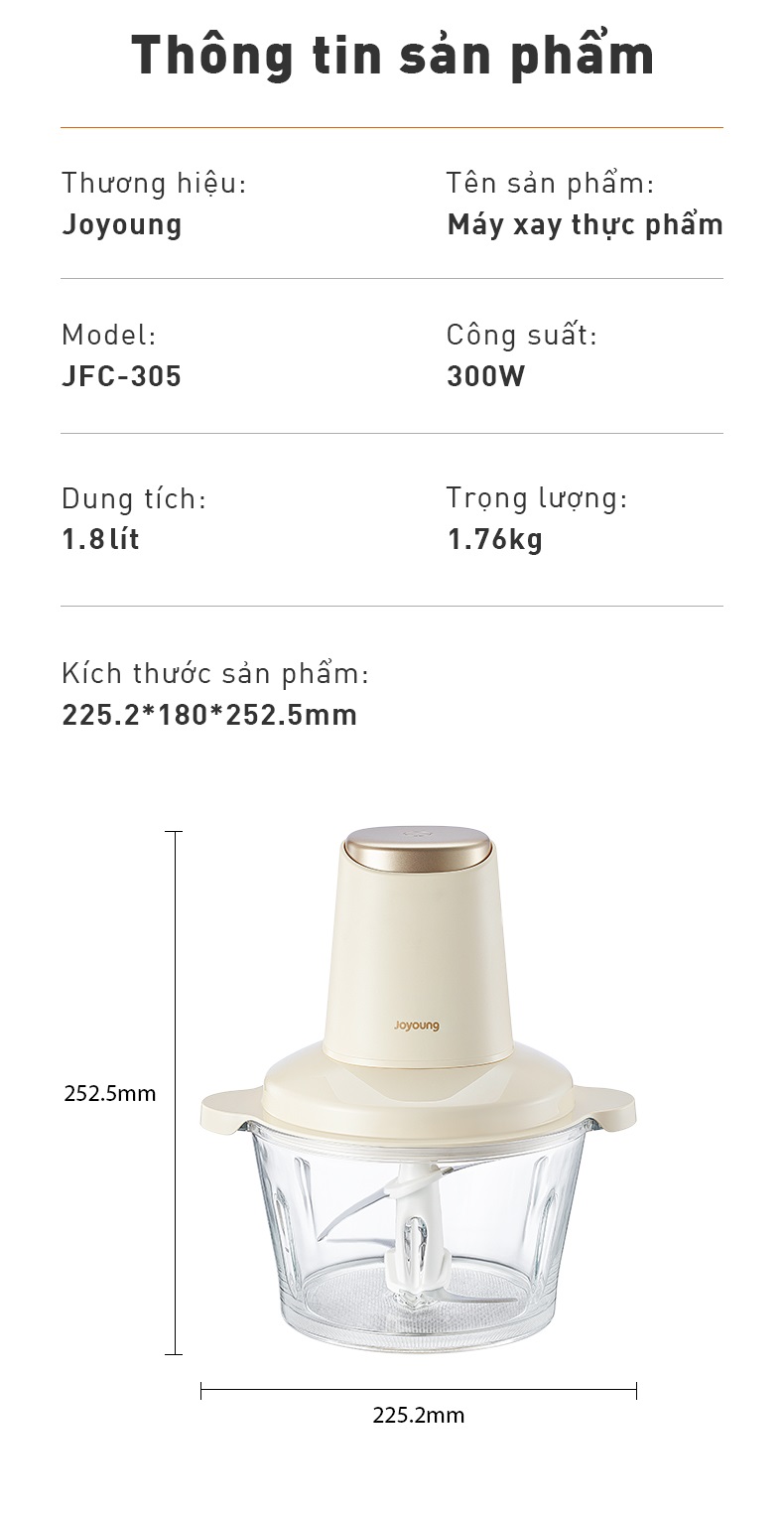 Khám phá Máy xay thực phẩm Joyoung 300W công suất mạnh mẽ, cối thủy tinh 1.8L, xay nhuyễn 500g thịt chỉ trong 1 lần. Bảo hành 2 năm, lỗi 1 đổi 1 trong năm đầu tiên.
