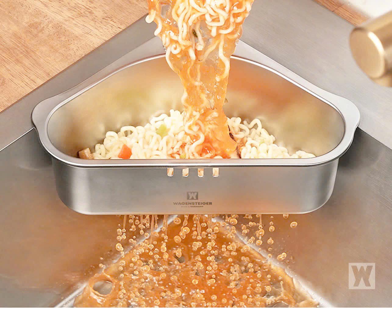 Rổ lọc treo góc Wagensteiger inox 18/10 cao cấp, thoát nước nhanh, an toàn. Tiện lợi rửa hoa quả, đựng đồ, lọc thức ăn, tiết kiệm không gian bồn rửa.